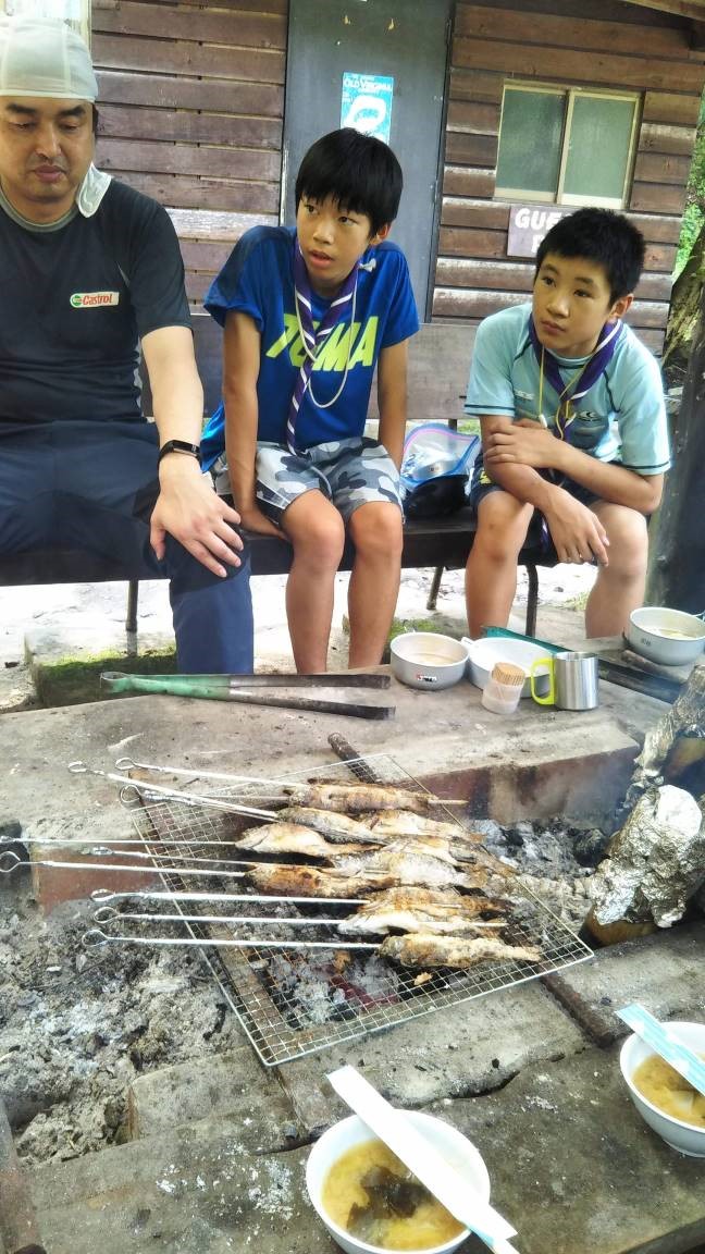 三番目として、捕獲したイワナから割り箸を使っての内臓取り(“壷取り”と言うらしい)をしました。バケツの中でも元気に逃げ泳ぐイワナを捕まえて左手でホールド(保持)し、右手に持った割り箸をイワナの口から一気に体の中に奥に差し込み、割り箸を回転して内臓を取り出します。この作業は頭で理解しているリーダも実は初体験で、4名のリーダも塩梅がわからず、スカウトと一緒に苦戦しました。イワナのためにも一気に事を成しえたかったのですが、かなり“イワナさん御免なさい”状態でした。二巡目以降のスカウトは手慣れたもので、なかなか上手にできていましたが、多少取り切れなかったイワナも有りました・・・が実は問題無いようです。鮎やイワナ等淡水魚は岩場の苔を食しているので、動物性プランクトンを食している多くの海水魚と異なり寄生虫の危険が少なく、そのまま焼いて食べても特に問題はないとのことです。