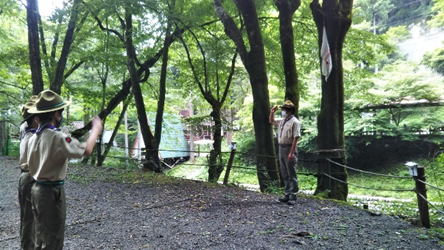夕食前の事。ここで謎の人物からの暗号文がCS隊長代行より届けられました。指示に従い場内を探すと地図と座標。さらに武田信玄の隠し金山にまつわる情報が…。ハイキング計画を立て明日は大マテイ山を目指すことになりました。
